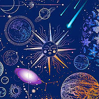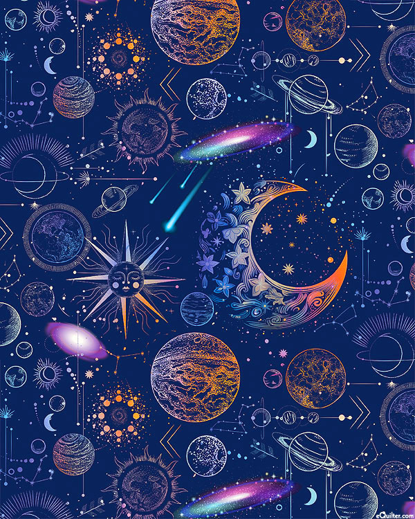 Suns, stars, and planets come together in a dreamy expression of celestial beauty. Larger moons are about 3", with pearlescent, 'Universe' from the 'Celestial Skies' collection by Skyline Studio for Benartex Fabrics.