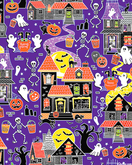 Costumed friends saunter through a spooky cemetery as ghosts and bats fly above an ominous mansion in the distance of this fun and festive Halloween-themed design. Larger houses are about 5", with glow-in-the-dark, 'Trick Or Treat' from the 'Chills & Thrills' collection by Kanvas Studio for Benartex Fabrics.