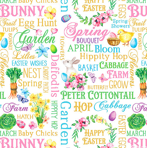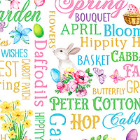 Words related to springtime are written across the design with Easter motifs scattered in the space between. Digitally printed, rabbits are about 2-1/4", 'Springtime Words' from the 'Cottontail Farms' collection by Nicole DeCamp for Benartex Fabrics.