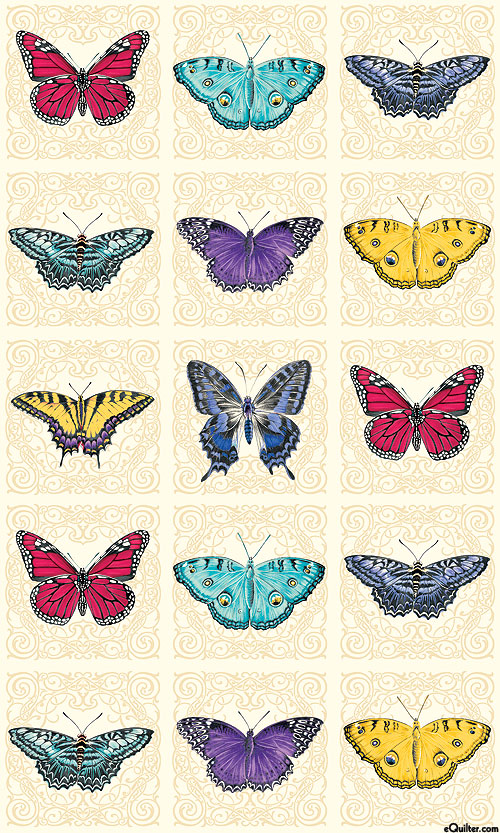 Panel blocks contain a colorful assortment of butterflies framed by elegant filigree against a solid background. 24" panel, with pearlescent, frames are about 7-1/4" x 7-1/4", 'Butterfly Nouveau' from the 'Circle of Butterflies' collection by Jackie Robinson for Benartex.