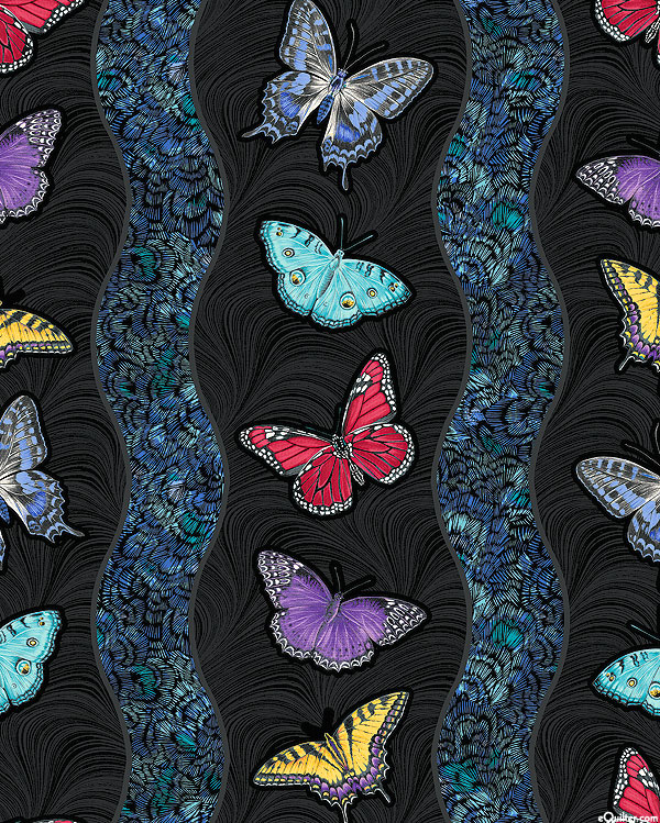 Wavy layered stripes contain a mesmerizing myriad of colorful butterflies fluttering gently against a swirling background of subtle marble textures. Wider stripes are about 7-1/2", stripes run the length of the fabric, with pearlescent, 'Butterfly Split Pearl' from the 'Circle of Butterflies' collection by Jackie Robinson for Benartex.