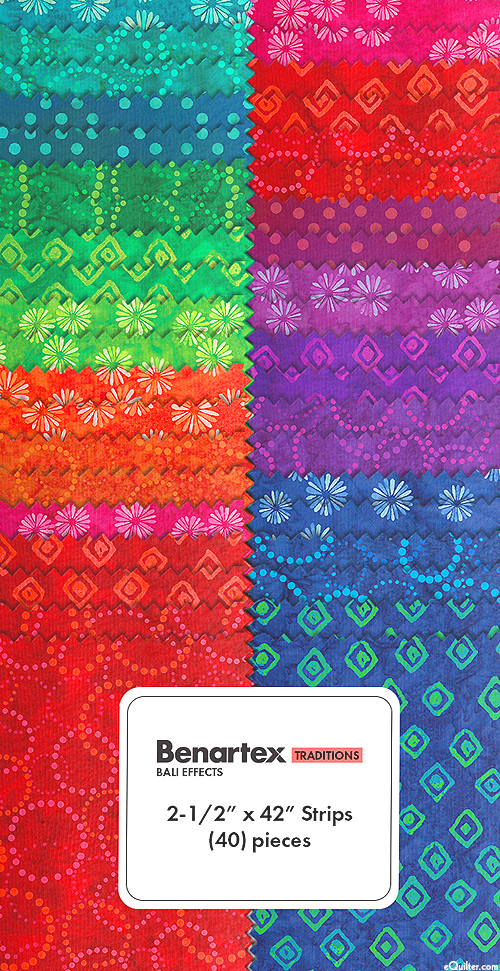 Charming patterns featuring imagery of floral bursts, dreamy diamonds, and dotted rings are presented in a variety of vivid colors, making a versatile pre-cut that can be used in a wide array of projects! 'Bali Effects' collection strip pack by Benartex Fabrics, pack includes forty 2-1/2" x 42" strips.