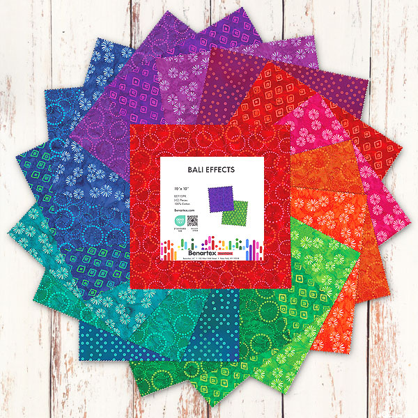 Charming patterns featuring imagery of floral bursts, dreamy diamonds, and dotted rings are presented in a variety of vivid colors, making a versatile pre-cut that can be used in a wide array of projects! 'Bali Effects' collection ten-square pack by Benartex Fabrics. Pack includes forty-two 10" x 10" squares.