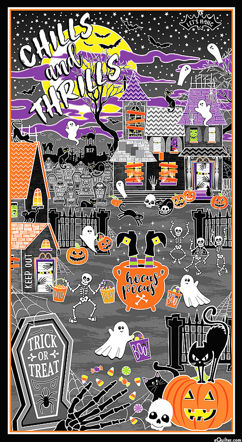 Costumed friends saunter through a spooky cemetery as ghosts and bats fly above an ominous mansion in the distance of this picturesque panel. 24" panel, with glow-in-the-dark, 'Chills & Thrills Panel' from the 'Chills & Thrills' collection by Kanvas Studio for Benartex Fabrics.