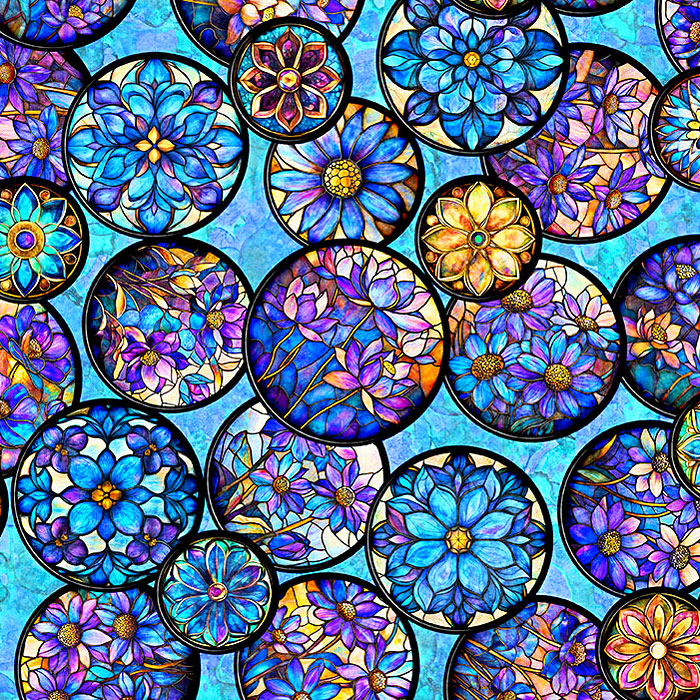 Stained glass medallions depicting charming floral vignettes are scattered against a mottled background in this dazzling design. Digitally printed, larger circles are about 2-3/4", 'Floral Circle Vignettes' from the 'Mosaic Blooms' collection by Dan Morris for Quilting Treasures.