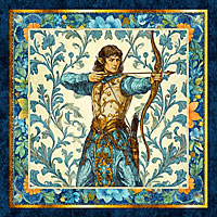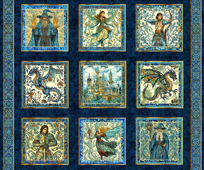 Panel blocks contain a magical assortment of fantasy motifs including wizards, elves, faeries, dragons, castles, and knights. Digitally printed, 36" panel, 'Large Medieval Picture Patches' from the 'Folklore' collection by Dan Morris for Quilting Treasures.