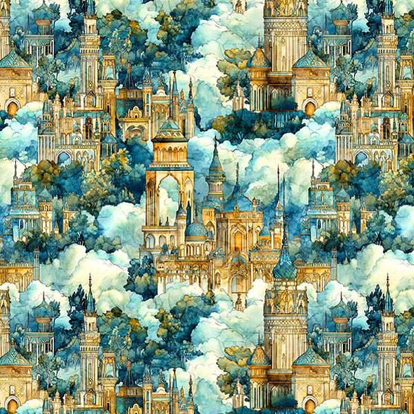 Floating through the clouds, a magical city emerges from the mist as tall spires of an exotic architecture soar into the heavens across this enchanting design. Digitally printed, larger castles are about 4", 'Castles in Clouds' from the 'Folklore' collection by Dan Morris for Quilting Treasures.