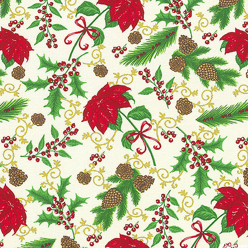 A merry medley of festive sprigs are scattered across the design including poinsettia flowers, pine cones, and holly berries. Larger poinsettias are about 2", with gold metallic, from the 'Tis The Season' collection.