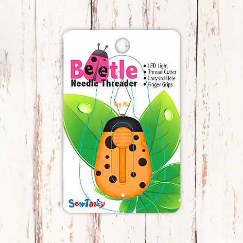 This colorful beetle-shaped needle threader comes equipped with an LED light and built-in thread cutter. It conveniently includes a lanyard slot just in case you want to keep the beetle on a leash. 'Beetle Needle Threader - Orange' by Sew Tasty.