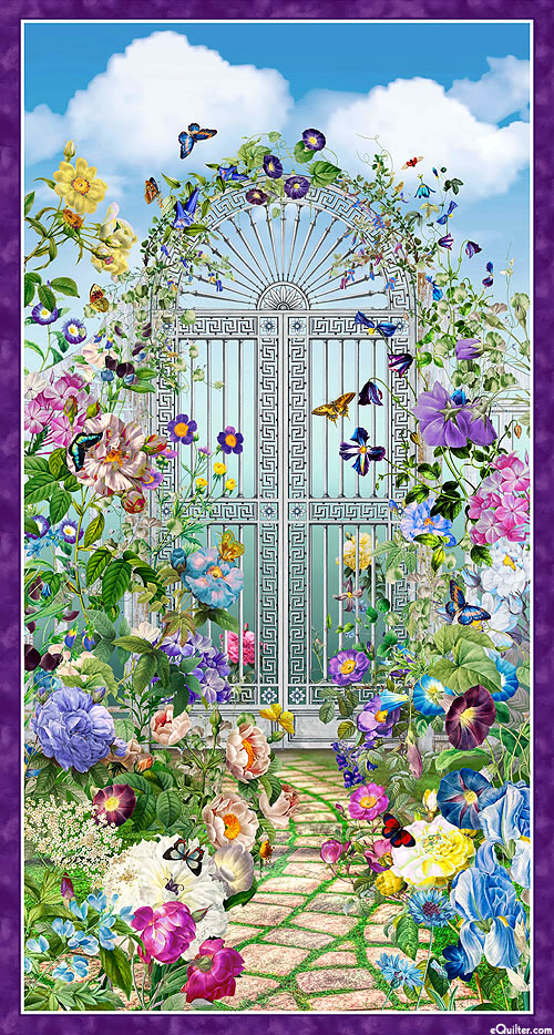 In this panel, butterflies flutter freely above a lavish garden gateway overgrown in lush florals. Digitally printed, 24" panel, 'Gateway Panel' from the 'Botanical Garden' collection by Aimee Stewart for Michael Miller Fabrics.