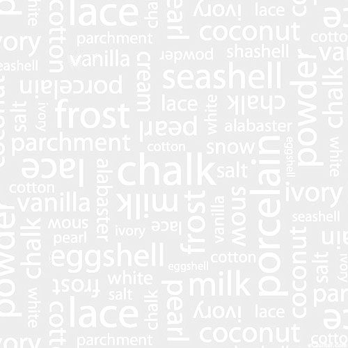 Random words are written all across this white on white. Taller text is about 1/2", a true white on white, 'White Wash' from the 'White Hot' collection by Moda Fabrics.