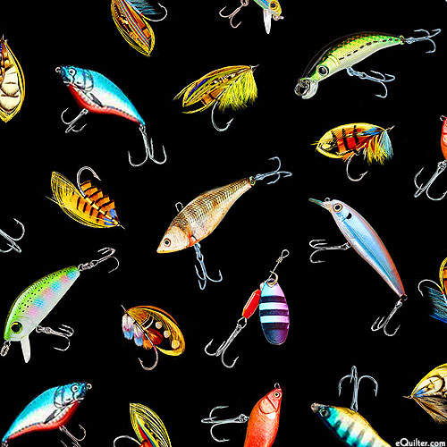 Digitally printed, larger fishing lures are about 3", 'Bait And Tackle' from the 'Girls Gone Fishing' collection by Michael Miller Fabrics.