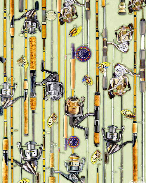 Digitally printed, larger fishing poles are about 14", 'Keeping It Reel' from the 'Girls Gone Fishing' collection by Michael Miller Fabrics.