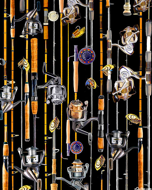 Digitally printed, larger fishing poles are about 14", 'Keeping It Reel' from the 'Girls Gone Fishing' collection by Michael Miller Fabrics.