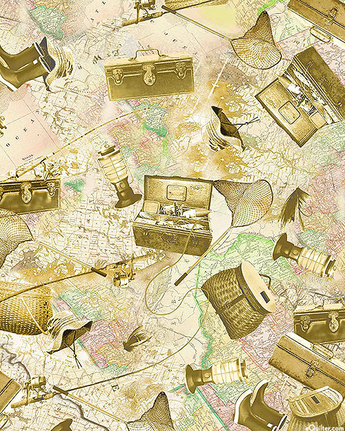 Digitally printed, larger boxes are about 2-1/2", 'Anglers Hangout' from the 'Girls Gone Fishing' collection by Michael Miller Fabrics.