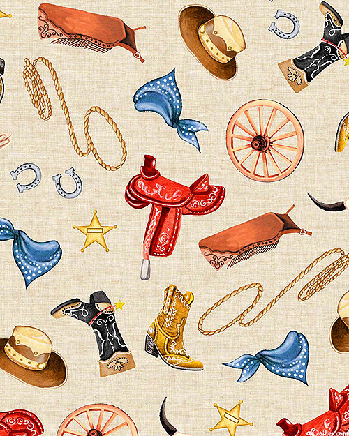 Larger objects are about 2", 'Cowhand Gear' from the 'Happy Trails' collection by Michael Miller Fabrics.