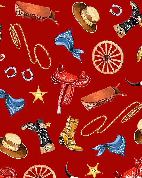 Larger objects are about 2", 'Cowhand Gear' from the 'Happy Trails' collection by Michael Miller Fabrics.