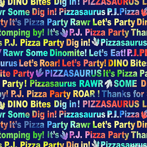 Digitally printed, taller text is about 3/8", text runs from selvedge to selvedge, 'Pizza Party Spirit' from the 'Dino Pizza Party' collection by Michael Miller Fabrics.