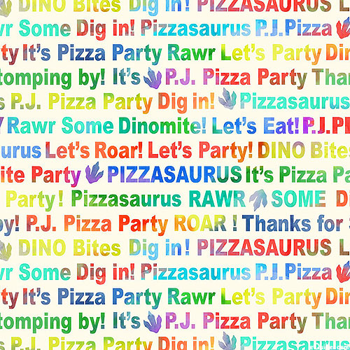 Digitally printed, taller text is about 3/8", text runs from selvedge to selvedge, 'Pizza Party Spirit' from the 'Dino Pizza Party' collection by Michael Miller Fabrics.