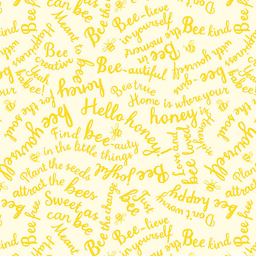 Bee-themed slogans are written across the design in bright and bold colors. Digitally printed, taller text is about 1/2", 'Bee Creative' from the 'Meant To Bee' collection by Louise Nisbet for Michael Miller Fabrics.