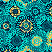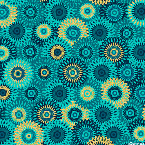 Elegant medallions layered atop one another are neatly arranged into rows across the design. Larger medallions are about 1-1/4", with gold metallic, 'Fancy Medallion' from the 'Magnificent Peacock' collection by Michael Miller Fabrics.