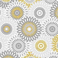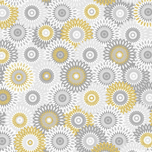 Elegant medallions layered atop one another are neatly arranged into rows across the design. Larger medallions are about 1-1/4", with gold metallic, 'Fancy Medallion' from the 'Magnificent Peacock' collection by Michael Miller Fabrics.