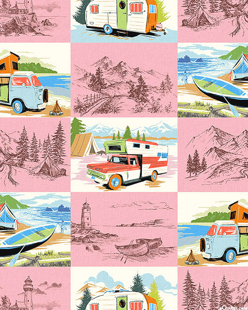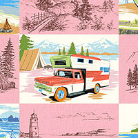 Imagery of campers and canoes are depicted between sweeping vistas full of lush forest scenery. Digitally printed, larger frames are about 4-1/4", 'Enjoy The Journey' from the 'Retro Road Trip' collection by Michael Miller Fabrics.