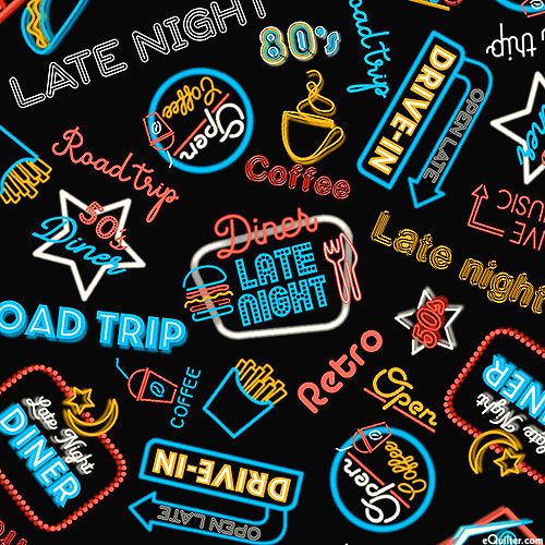 Neon signs for diners one might might find next to the highway on a road trip are scattered across the design. Digitally printed, larger signs are about 2-1/2", 'Road Trip Diner' from the 'Retro Road Trip' collection by Michael Miller Fabrics.
