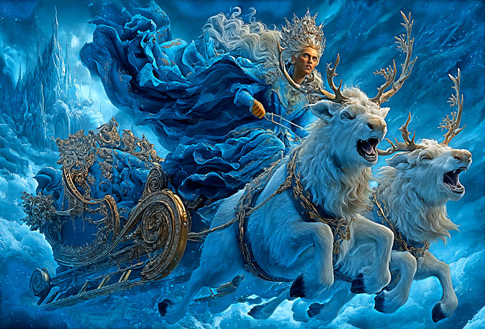 From beloved fairy tale author, Hans Christian Andersen, an impressive scene from the "Snow Queen" comes to life as the the Queen herself rides a mighty sleigh drawn by reindeer across a frigid landscape in this picturesque panel. Digitally printed, 29" panel, 'Snow Queen' by the Rubin Design Studio, designed exclusively for eQuilter.