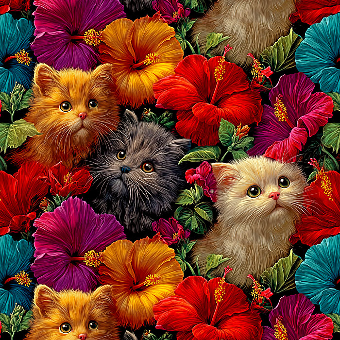 Cute kittens are piled between colorful flower blossoms in this adorable pet-lovers design. Digitally printed, kitties are about 3" 'Kittens with Hibiscus 1' by the Rubin Design Studio, designed exclusively for eQuilter.