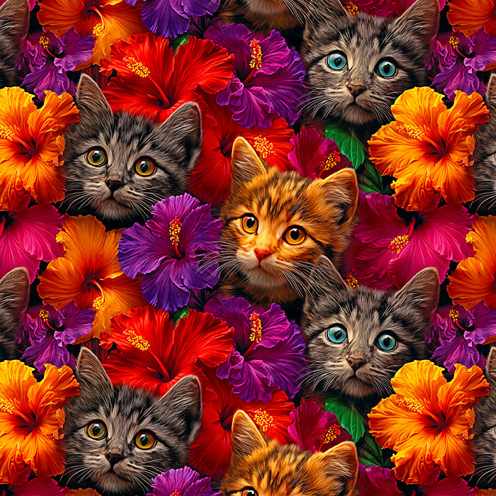 Cute kittens are piled between colorful flower blossoms in this adorable pet-lovers design. Digitally printed, kitties are about 3-1/2" 'Kittens with Hibiscus 2' by the Rubin Design Studio, designed exclusively for eQuilter.