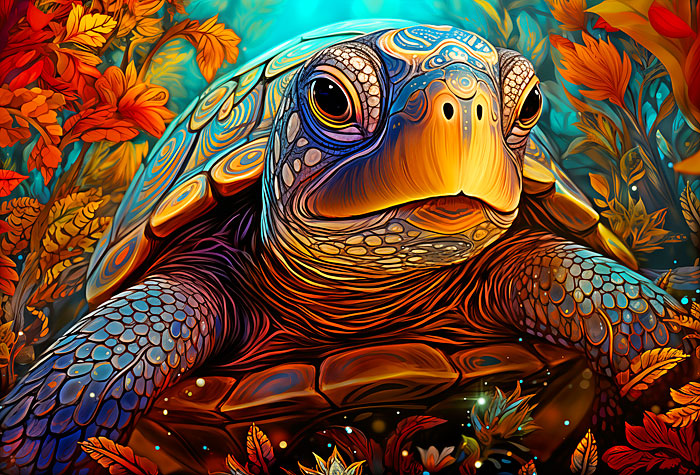 The captivating face of an intricately adorned sea turtle emerges from delicately illustrated patterns reminiscent of those found in mandalas and zentangle designs. Digitally printed, 29" panel, 'Magical Sea Turtle' by the Rubin Design Studio, designed exclusively for eQuilter.