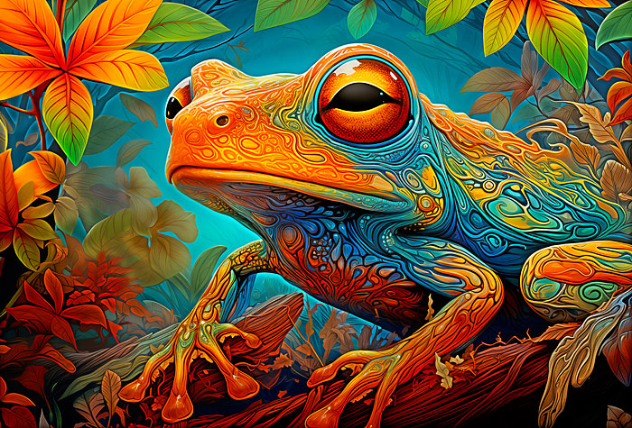 The captivating face of an intricately adorned frog emerges from delicately illustrated patterns reminiscent of those found in mandalas and zentangle designs. Digitally printed, 29" panel, 'Magic Frog' by the Rubin Design Studio, designed exclusively for eQuilter.