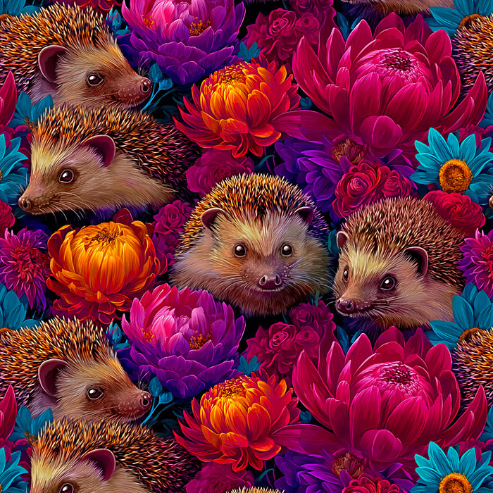 Cute hedgehogs are piled between colorful flower blossoms in this adorable animal-lovers design. Digitally printed, hedgehogs are about 3" 'Night Garden Hedgehogs' by the Rubin Design Studio, designed exclusively for eQuilter.