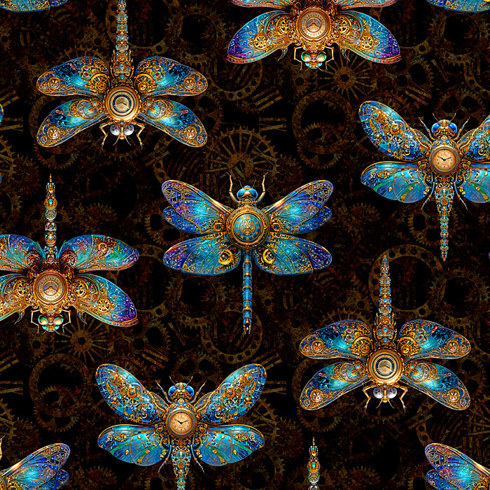 Depicted against a background of rusty gears are a vibrant variety of dragonflies decorated in a mesmerizing assortment of metallic and mechanical steampunk gear. Digitally printed, dragonflies are about 3-1/2" 'Iridescent Steampunk Dragonflies' by the Rubin Design Studio, designed exclusively for eQuilter.