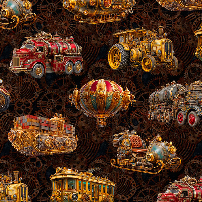 Depicted against a background of rusty gears are a vibrant variety of industrial vehicles decorated in a mesmerizing assortment of metallic and mechanical steampunk gear. Digitally printed, vehicles are about 3-3/4" 'Steampunk Transportation Allover' by the Rubin Design Studio, designed exclusively for eQuilter.