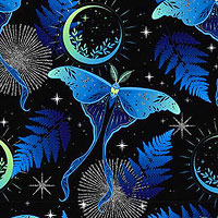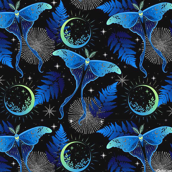 Lunar moths flutter between fragrant florals in a verdant forest beneath the soft glow of a crescent moon. Larger moths are about 3-1/2", with silver metallic, from the 'La Luna' collection by Jason Yenter for In The Beginning Fabrics.