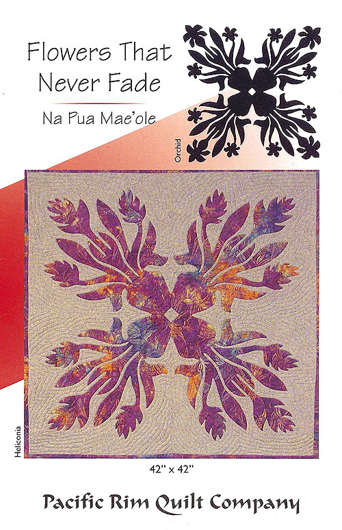 Create an heirloom 42" wall quilt (maybe a baby quilt?) using this Na Pua Mae'ole - Flowers That Never Fade Pattern. You can select from four different flower patterns - orchids, torch ginger, antherium, and/or heliconia for a varied bouquet of exotic blooms. In order to make this flowing pattern you will need 1 yard of applique fabric, 1 1/3 yards of background fabric, and 1 1/3 yards of backing fabric. Consider contrasting thread or subtle tone-on-tone applications. Have everything you need before you begin. Remember "'A 'ohe 'ulu e loa 'a i ka pokole o ka lu!" There is no success without preparation. 'Na pua Mae'ole' (Flowers that Never Fade) Hawaiian applique pattern, designed by Nancy Lee Chong. Finished size is about 42" x 42".
