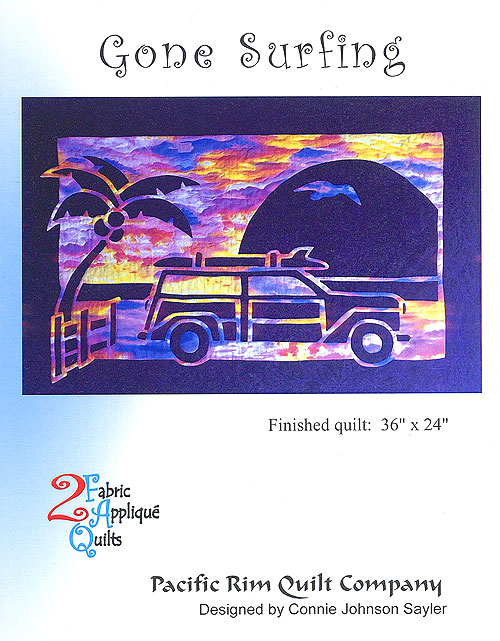 This two-fabric applique beach and surf design is elegantly simple! Just lay the applique fabric on top of the background fabric, and cut away the parts of the applique fabric that you don't need, exposing the background fabric! No templates, no numbering system, no positioning of small pieces to create the design. What could be easier? Materials Needed: 3/4 yd (or 1 yd if used to bind the quilt) background fabric; 3/4 yd (or 1 yd if using to bind the quilt) applique fabric; 3/4 yd backing; Applique thread to match the applique fabric; 39" x 27" batting; 39" x 27" double-sided fusible web. 'Gone Surfing' 2-fabric applique quilt pattern, finished size is about 36" x 24", designed by Connie Johnson Sayler.