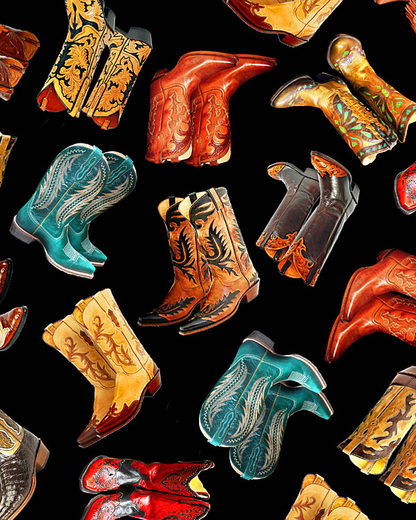 Cowboy boots decorated in impressive leathercraft give this fabric a distinct western-themed feel. Boots are about 3", 'Tossed Boots' from the 'Big Sky Country' collection by Michael Miller Fabrics.