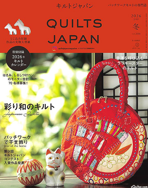 This high-quality 162-page glossy Japanese magazine contains beautiful photographs and illustrations, helpful project diagrams, and pattern inserts. A 2026 Quilts Japan Calendar is included in this special edition. 2026 is also the Year of the Horse so you might want to make a mini tapestry, plush toy, or ema-style quilt. This issue is full of projects that let you enjoy “Japan” through quilting: beautifully colored patchwork patterns, appliqué quilts, bags, a quilted deck of playing cards, Seven Lucky Gods plushies, a Kabuki-themed quilt, and more. It also introduces quilts by Japanese artists who have won awards and are active internationally. Enjoy the winning works from the 9th Quilt Japan Contest, as well as serialized projects and articles by well-known quilt artists such as Keiko Miyauchi, Kumiko Fujita, Masako Wakayama, and Tomomi Mimura. Quilts Japan Magazine - January, 2026 - Text is in JAPANESE.
