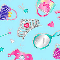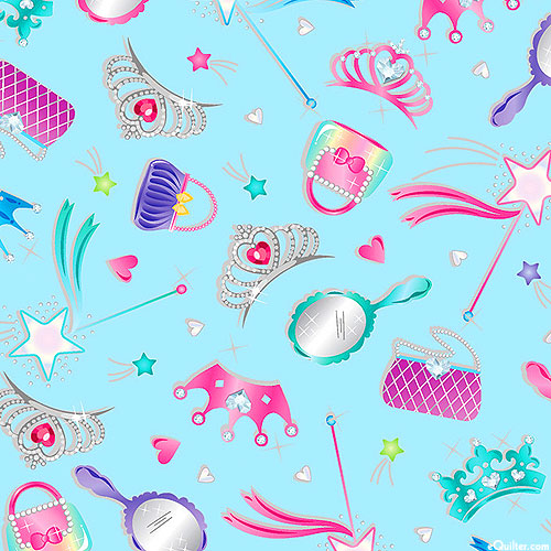 Digitally printed, larger objects are about 2", 'Princess Accessories' from the 'Fairytale Dreams' collection by Kanvas Studio for Benartex.