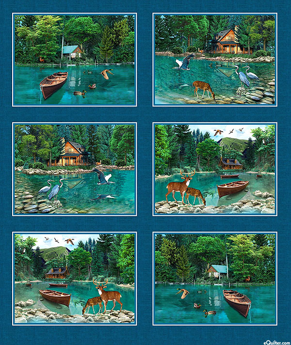 In this panel, a collection of various lakeside views feature serene scenes of cabins, boats, deer, and ducks. Digitally printed, 39" panel, panel has six frames about 16" x 12", 'Scenes Of Our Lake' from the 'Welcome To Our Lake' collection by Michael Miller Fabrics.