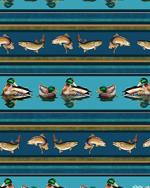 Serene lake views of majestic mallards and tranquil trout are depicted across this scenic striped design. Digitally printed, wider stripes are about 2-1/8", stripes run the length of the fabric, 'Lake Stripe' from the 'Welcome To Our Lake' collection by Michael Miller Fabrics.