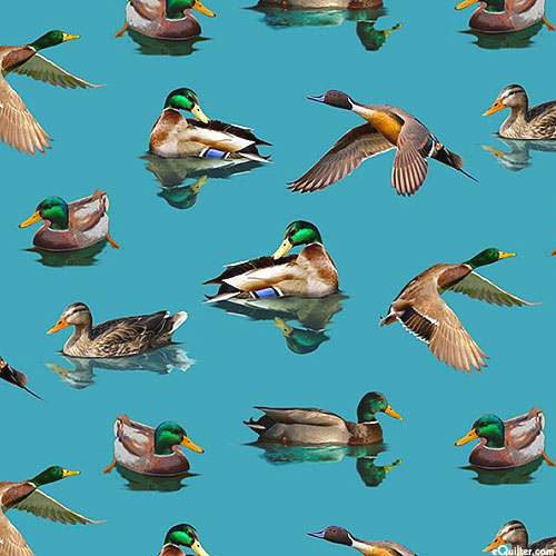 Majestic mallards pose magnificently as they float and fly on a serene lake scene. Digitally printed, larger ducks are about 3", 'Ducks On Our Lake' from the 'Welcome To Our Lake' collection by Michael Miller Fabrics.