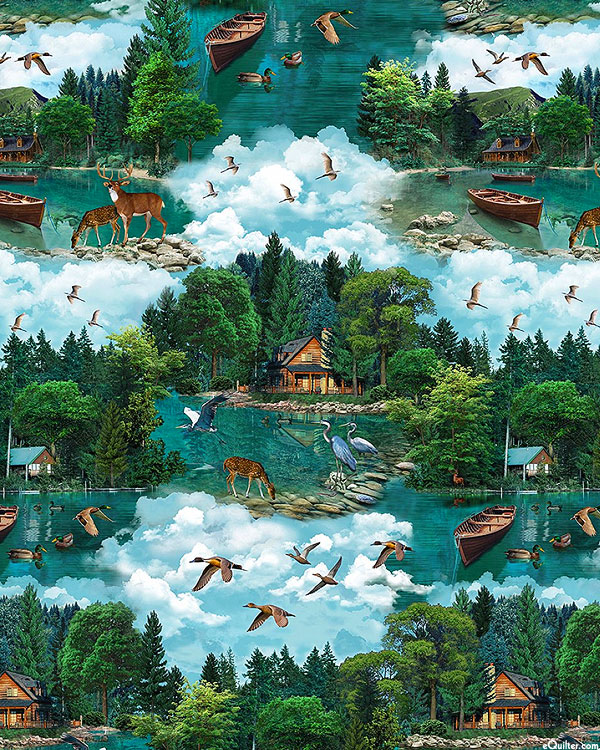 A collection of various lakeside views feature serene scenes of cabins, boats, deer, and ducks. Digitally printed, larger cabins are about 4-1/2", 'Our Lake' from the 'Welcome To Our Lake' collection by Michael Miller Fabrics.