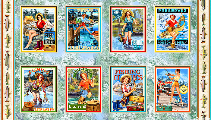 Framed within assorted panel blocks are a collection of various stylish ladies dressed for an adventurous day of fishing together. Digitally printed, 24" panel, panel has eight frames about 7-1/2" x 9-1/2", 'Fishing Lures' from the 'Girls Gone Fishing' collection by Michael Miller Fabrics.