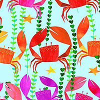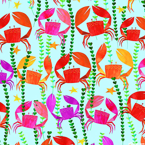 Colorful crabs raise their pincers in the air as they dance among the wavy sea grass of this fun oceanic design. Larger crabs are about 2", 'Crawling Crabs' from the 'Colorful Aquatic World' collection by Melanie Mikecz for Michael Miller Fabrics.