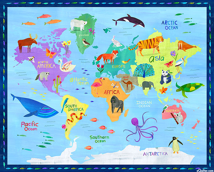 This panel features a world map with a variety of colorful animals placed within their respective continents where they can be found including orca whales, polar bears, puffins, moose, swans, raccoons, whales, parrots, snakes, gorillas, flamingos, foxes, rabbits, tigers, walrus', pandas, elephants, camels, peacocks, turtles, koalas, whales, octopi, and penguins. 36" panel, 'Animals Around The World Map' from the 'Colorful Aquatic World' collection by Melanie Mikecz for Michael Miller Fabrics.