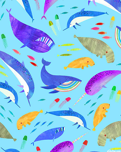 Assorted cetacea and fish swim together across this lovely aquatic design including blue whales, sperm whales, narwhals, dolphins, and jellyfish. Larger whales are about 7", 'Friends Of The Sea' from the 'Colorful Aquatic World' collection by Melanie Mikecz for Michael Miller Fabrics.